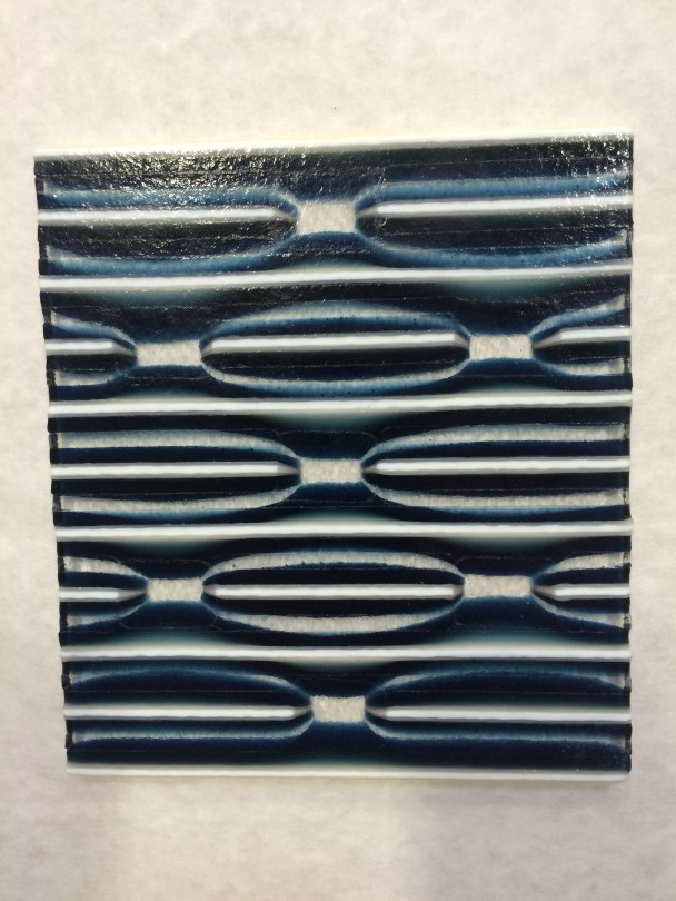 Strip cut tile January 12, 2016 2448 × 3264 Kilnformed glass Strip cut + flow 4″ tile of steel blue, french vanilla, clear glass in 3/8″ strips stacked sideways. Kiln side showing. Like Loading...