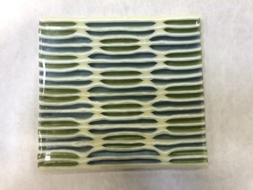 Strip cut tile January 12, 2016 3264 × 2448 Kilnformed glass Strip cut + flow 4″ tile of glass in 3/8″ strips stacked sideways. Kiln side showing. Like Loading...