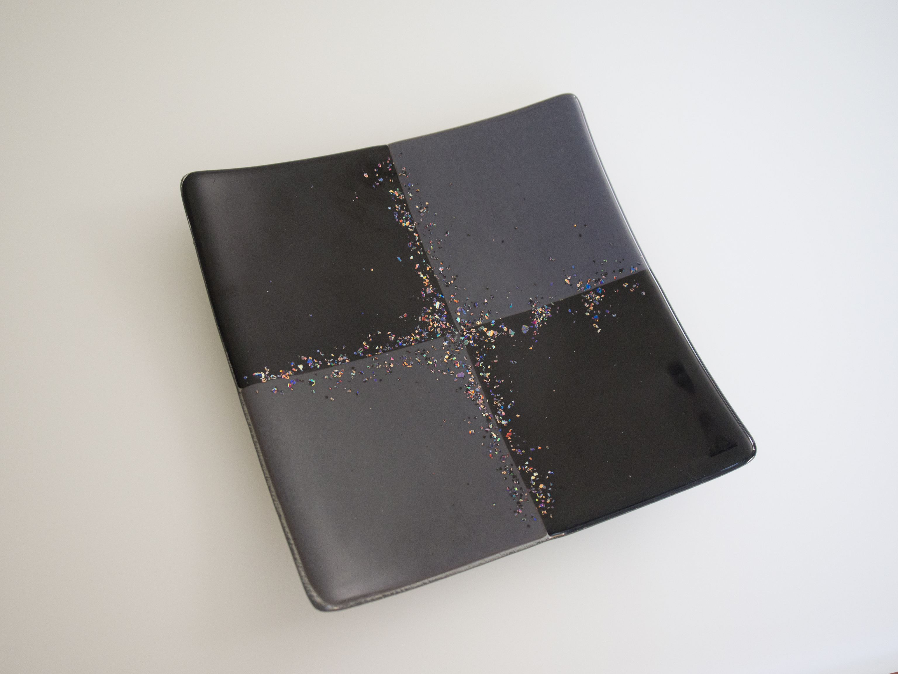 Grid of dichroic flakes January 12, 2016 3072 × 2304 Kilnformed glass Grid of dichroic flakes 8×8″ plate of black and grey squares with dichroic flakes Like Loading...