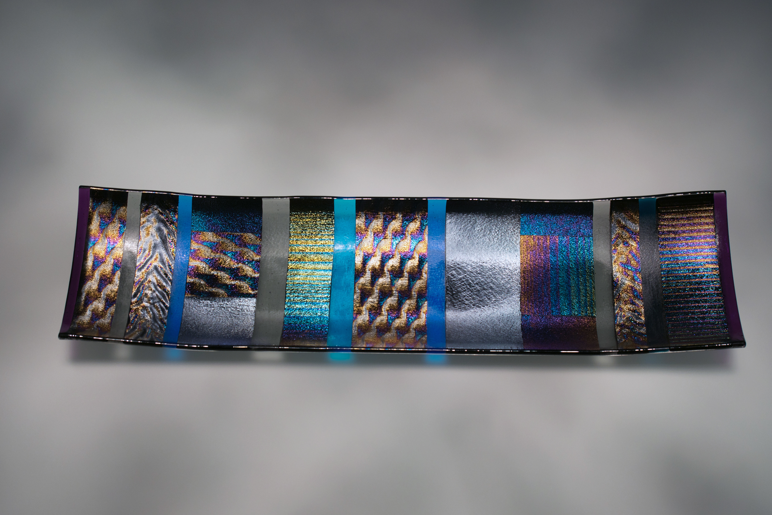 Iridescent platter January 12, 2016 2520 × 1680 Kilnformed glass Iridescent platter 5×16″ channel plate of iridescent patterned glass [Not available – ask for similar creations] Like Loading...