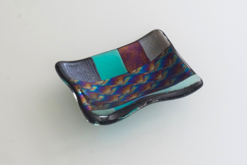 Metallic black dip dish [SOLD] August 25, 2016 2520 × 1680 Metallic black dip dish [SOLD] Metallic plate of black irid design with transparent blues [SOLD] 3×4 Small metallic black dip dish