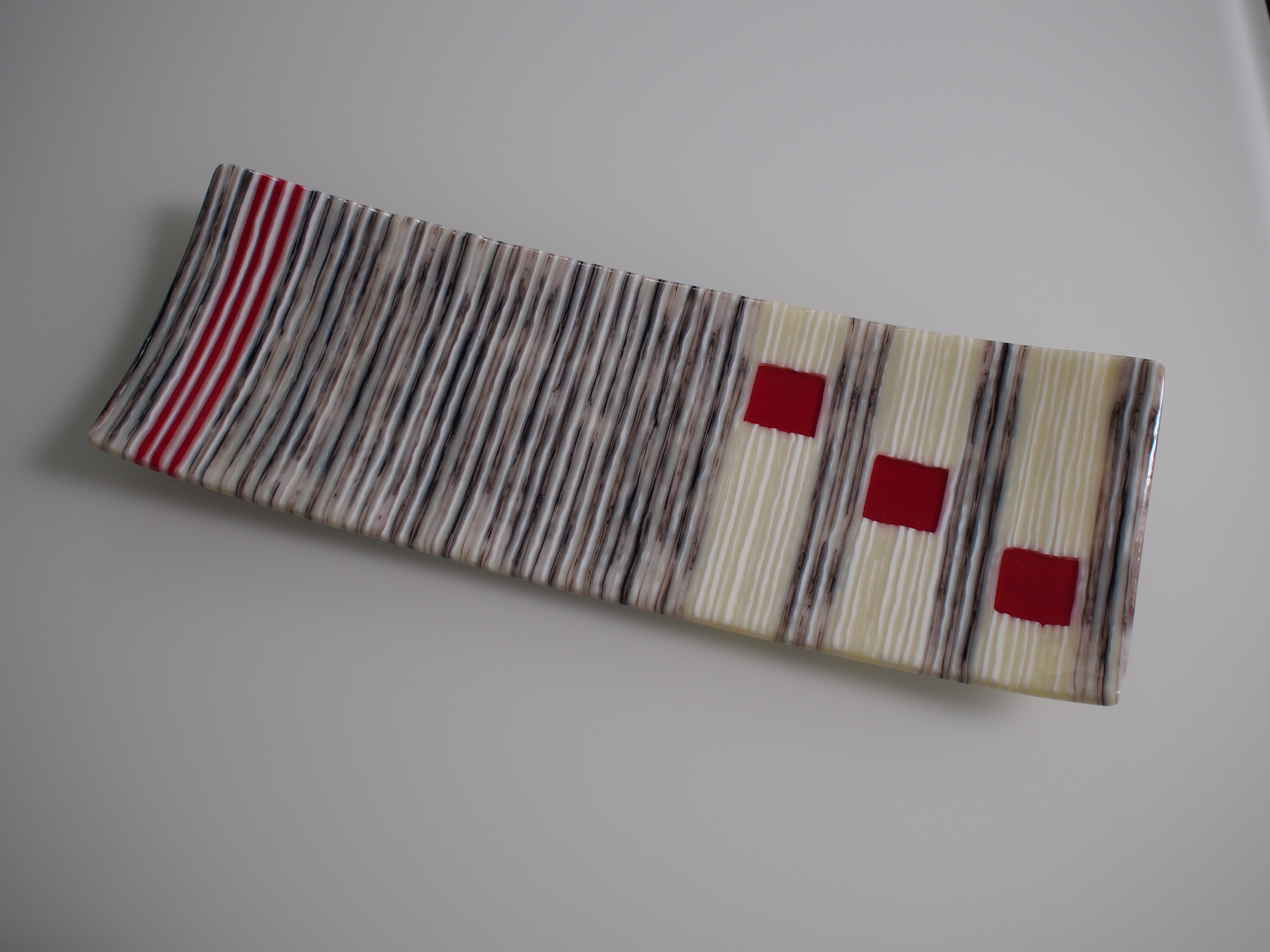 14″ strip constructed platter [SOLD] January 10, 2019 4608 × 3456 14″ strip constructed platter [SOLD] 14″ strip constructed platter in white/dark brown streaky glass and French Vanilla with red accents