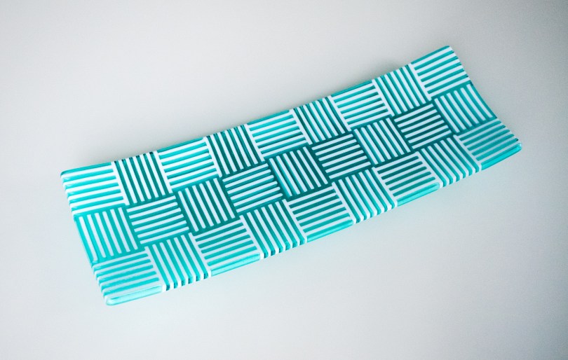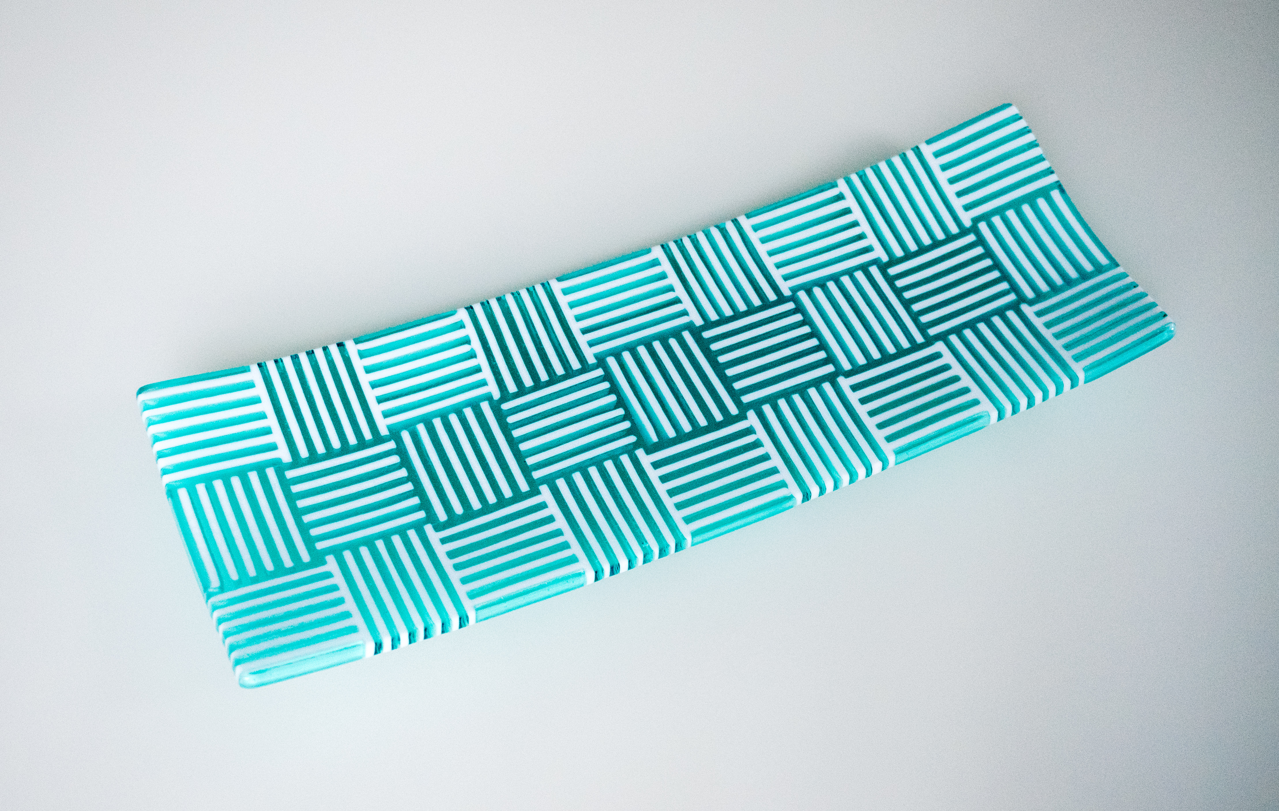 Aqua strip constructed platter [SOLD] June 13, 2019 4436 × 2815 Aqua strip constructed platter [SOLD] Strip constructed platter of aqua and white strips carefully aligned in an alternating grid of squares [SOLD]