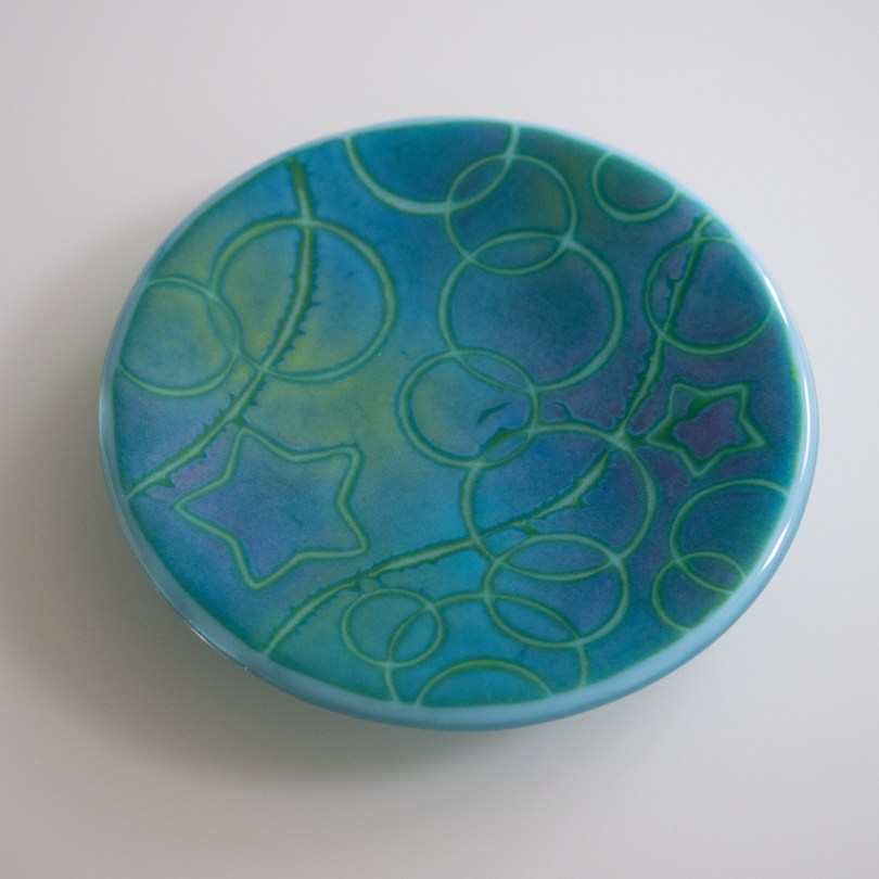 6″ “batiky” dish [SOLD] June 22, 2019 3456 × 3456 6″ “batiky” dish [SOLD] 6″ “batiky” dish in a blend of greens, blues, purples on robin’s egg sheet glass [SOLD]