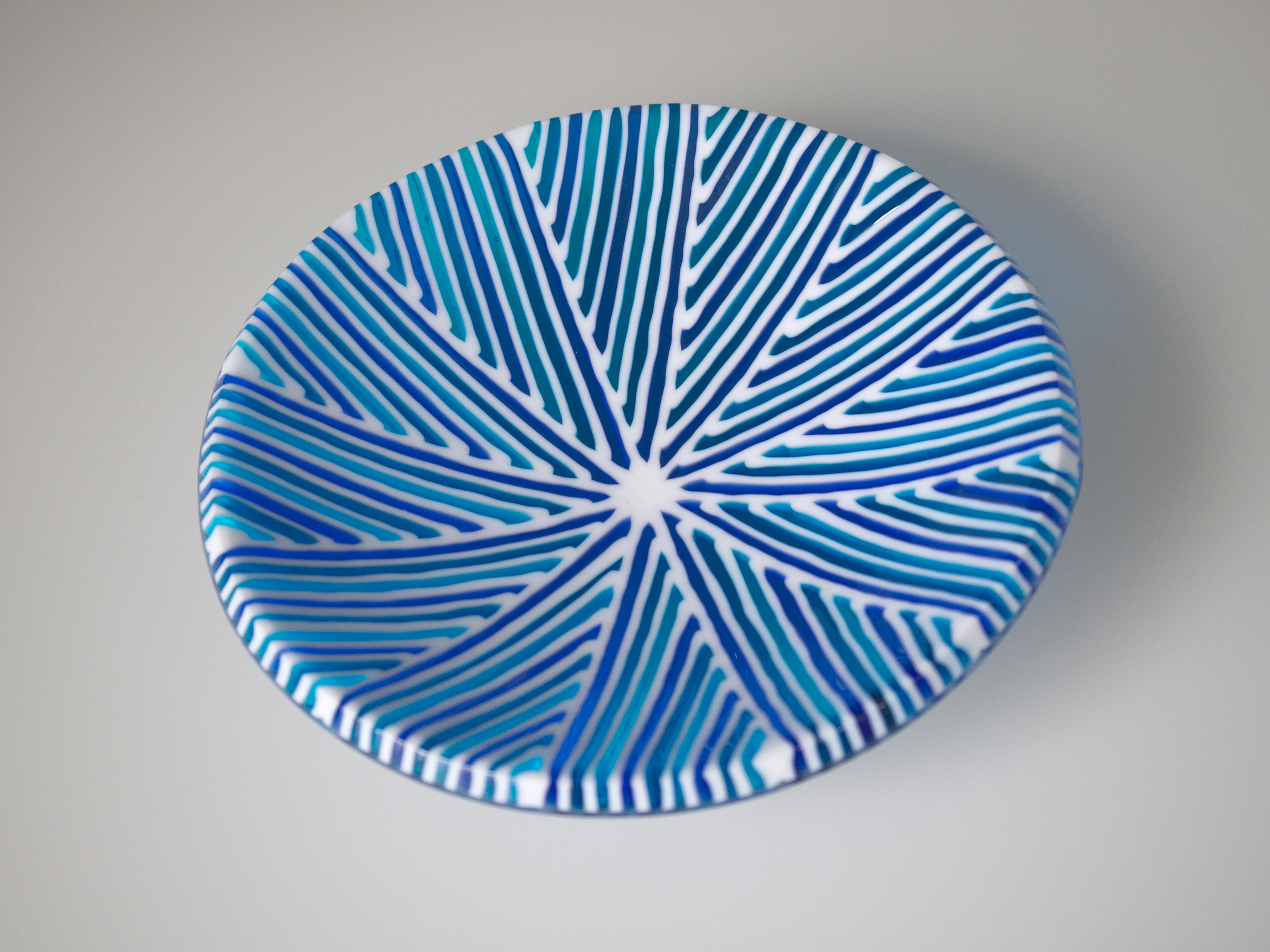 Blue Art Deco Bowl [Not available] April 1, 2016 2520 × 1890 Blue Art Deco Bowl [Not available] Radial strip cut construction in blues and white 8″ art deco bowl [No longer available – ask for similar creations]